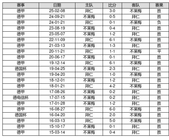 拜仁 VS 不莱梅两队近10年的交战次数为22场,拜仁20胜1平1负,赢球概率为90.9%,平局概率为4.5%,输球概率为4.5%。