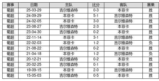本菲卡 VS 吉尔维森特两队近10年的交战次数为13场,本菲卡11胜0平2负,赢球概率为84.6%,平局概率为0.0%,输球概率为15.4%。