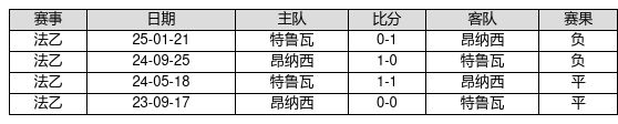 特鲁瓦 VS 昂纳西两队近10年的交战次数为4场,特鲁瓦0胜2平2负,赢球概率为0.0%,平局概率为50.0%,输球概率为50.0%。