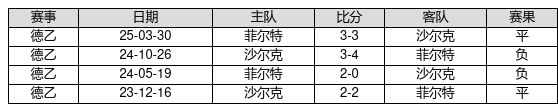 沙尔克 VS 菲尔特两队近10年的交战次数为4场,沙尔克0胜2平2负,赢球概率为0.0%,平局概率为50.0%,输球概率为50.0%。