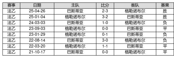 格勒诺布尔 VS 巴斯蒂亚两队近10年的交战次数为8场,格勒诺布尔2胜3平3负,赢球概率为25.0%,平局概率为37.5%,输球概率为37.5%。