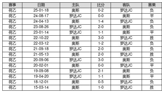 奥斯 VS 罗达JC两队近10年的交战次数为15场,奥斯3胜4平8负,赢球概率为20.0%,平局概率为26.7%,输球概率为53.3%。