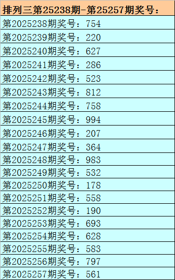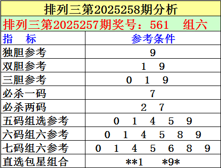 1.排列三最近十期分别开出号码:983-532-178-558-190-693-628-583-797-561,其中有6期奖号开出了上期的重复号码,本期预计第2025257期奖号:561中有重号,参考号码:1。