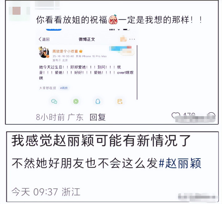 比起她们的姐妹情深,更让网友感兴趣的是,周放祝福里那句“好好爱她”,更像是对某个特别的人喊话,要对方好好对待赵丽颖。