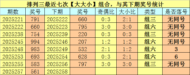 大小分析:排列三上期开出号码561,大小类型为【大大小】,最近七次开出大小类型大大小的奖号分别为:791、660、754、994、983、693、583,其下期分别开出号码:660、795、220、207、532、628、797。其中号码大小比为12:9,大小 号码开出比例基本相等,本期预计小 号转热,关注大小比1:2。